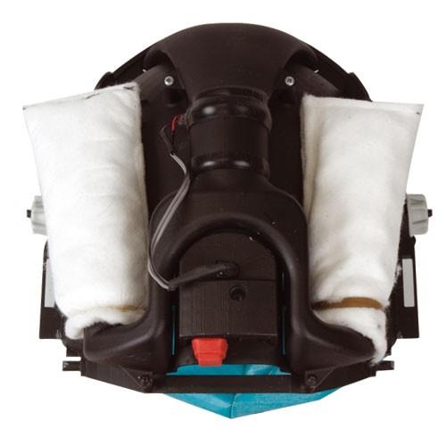 Motor positioned away from the sensitive area of the forehead to reduce noise and irritation.