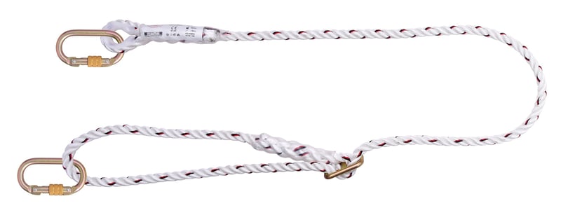 Features & Benefits • Adjustable up to 2m• Made from 14mm Polyamide 3-strand twisted rope (complying to ISO 1140)• Black and red tracer in the rope to indicate degradation of material• Manual ring type adjuster of forged alloy steel• Rope ends spliced and covered with polyethylene protective sleeve• Abrasion resistant thimbles provided within loops• Conforms to EN 358:1999Delivered With • 2 screw gate connectors in alloy steel. Gate opening 18 mm. Conforms to EN 362:2004 class B & M