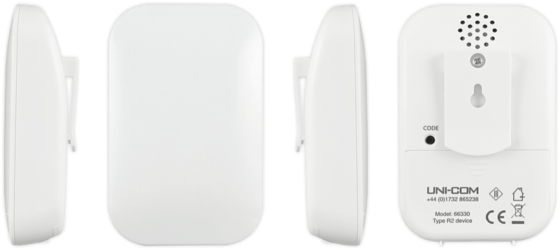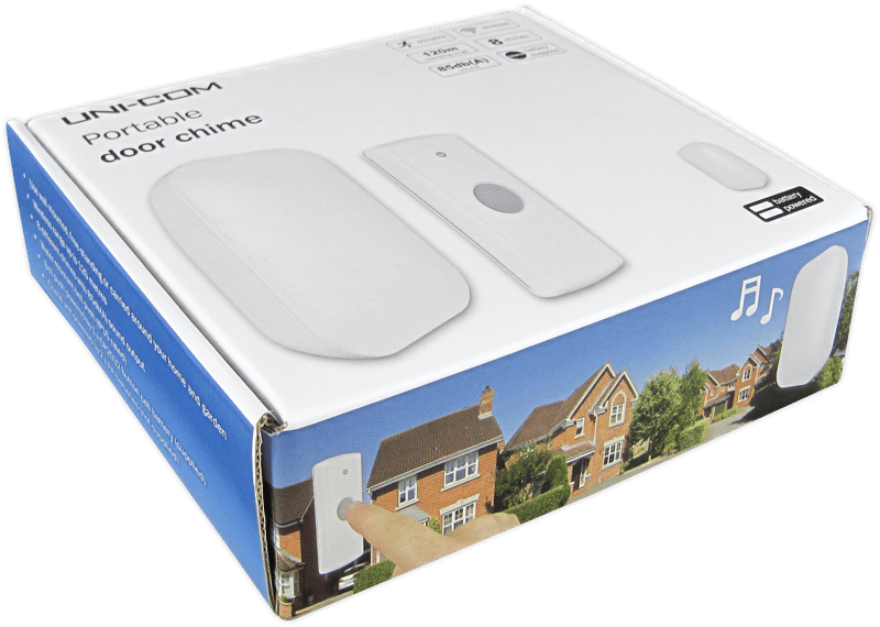This portable door chime can be used wall mounted, free-standing or carried. The extensive wireless range of up to 120 metres means the chime unit can be carried from room to room and outside into the garden to ensure a visitor is never missed. The weather resistant bell push is easy to attach near your front door and is paired quickly to your chime unit. The chime unit can be programmed to one of 8 chimes that include the Westminster chime, traditional Ding Dong or a barking dog for increased security.This Uni-Com door chime is one model of an exclusive Amazon range, they all work together and can be mixed and matched throughout your home. Each model offers its own unique features to help cater for different types of lifestyles.Features: