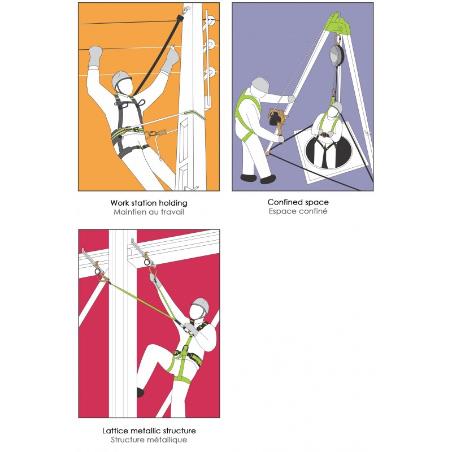 Attachment Elements - 2 Chest attachment textile loops and a dorsal attachment D-Ring for fall arrest, 2 lateral D-Rings for work positioning. Unique extension band (length 30 cm) which allows the user to easily connect himself to the dorsal attachment D-Ring without any external help.