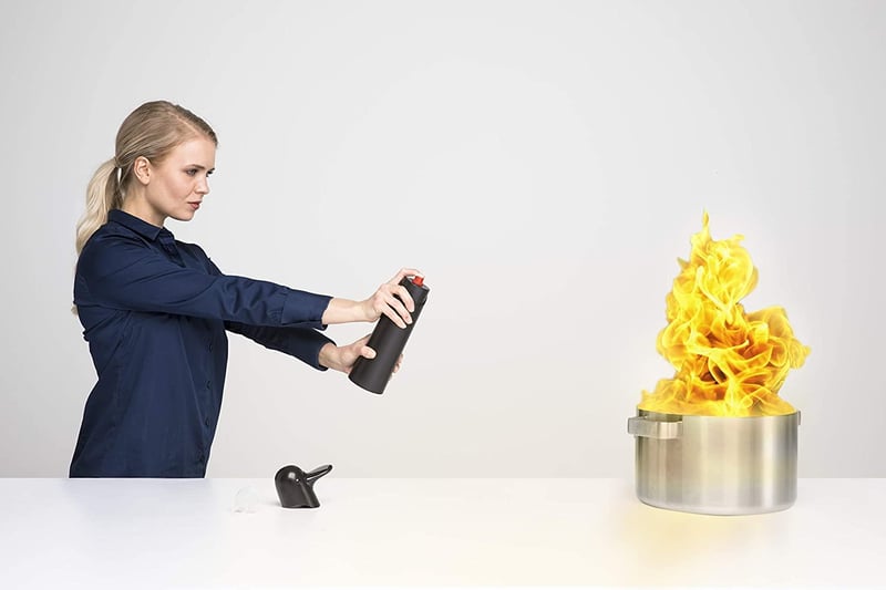 Compact fire extinguisher for grease and cooking oil fires in the kitchen. Fire rating 25F/2A