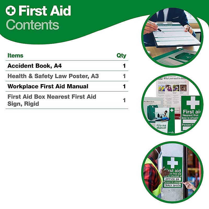 ?This pack ensures your business has all the necessary signs, manuals and recording methods to comply with HSE guidelines. Additionally the self adhesive pads provided allow you to stick the signs to the walls. Includes Accident Book, Health & Safety Law Poster, Workplace First Aid Manual, First Aid Box Nearest First Aid Sign and Self Adhesive Pads