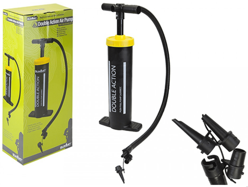 This Summit 2L double action hand pump enables you to quickly and efficiently inflate your airbeds, inflatable pools and beach inflatables. It works by a handle which you push in and out of the pump while standing on the foot supports. Air is forced out of the piston, both with the up and downward movement providing continuous air flow for easy inflation. As a result this pump inflates twice as fast as normal pumps. Supplied with multi-use adapters and can also be used for easy deflation.
