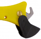 Optional hook blade for cutting cardboard & tape. Only blunt edges are exposed.