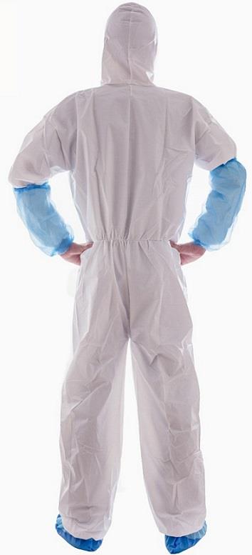 Coverall made of polypropylene laminated with a microporous polyethylene film, with zipper and hood, elasticated arm, and foot band (latex-free). Lightweight and breathable, air-permeable, and waterproof. Supplying a normal barrier against dry particles and a limited liquid splash of chemicals. Features: