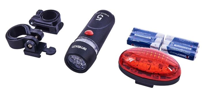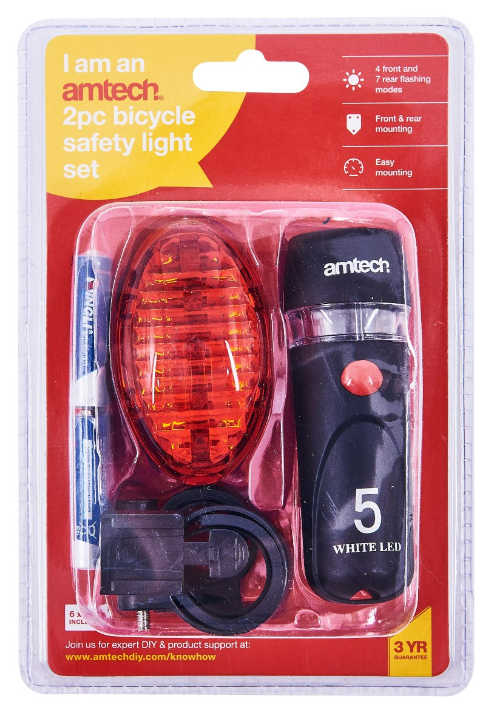 Set includes 5 LED (white) bicycle light with modes (on, flashing, strobe and off) plus a 5 LED (red) lamp with 7 modes