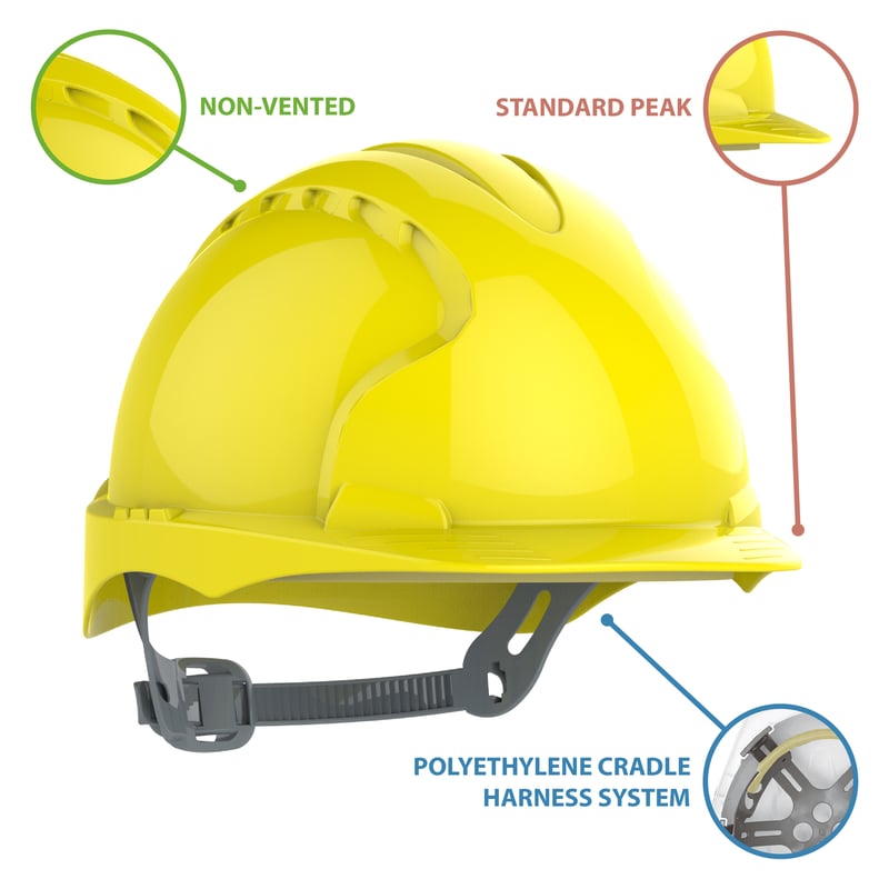 JSP - The All New EVO2 Helmet - Yellow Hard Hat - Standard Peak with OneTouch 3D Adjustment Slip Ratchet Harness - [JS-AJE030-000-200]