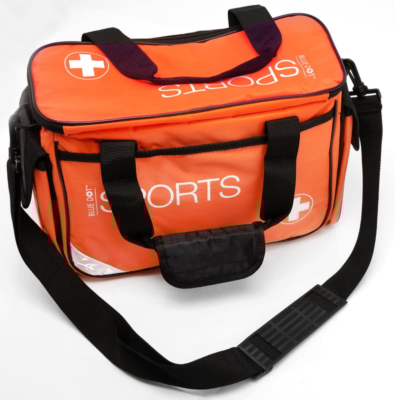 A comprehensive range of first aid products, which will treat the majority of sports related injuries. Comes in a bright orange bag with reflectors. The bag has four rubber feet, to reduce absorption of moisture when placed on wet ground. There are eight internal compartments, with a separate exterior pocket at each end, which can be used holding water bottles. There is a further front pocket with separate zip, which can be used to keep a range of bandages or tapes. Includes a shoulder carrying strap. An ideal kit for professionals.