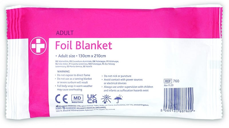 A disposable, ultra-insulating emergency blanket. Both sides have a heat-reflective metallic surface that will retain over 90% of body heat. As well as retaining most radiated body heat, it will also protect against wind and rain. Ideal for treating or preventing hypothermia.