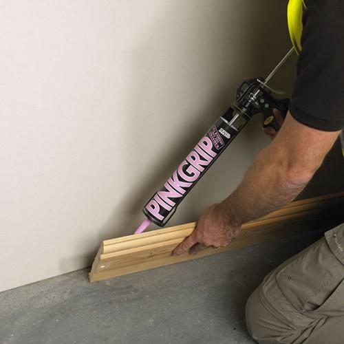 Pink Grip is a revolutionary direct bond adhesive specifically formulated for the professional user, using polymers at the leading edge of adhesive technology. Pinkgrip will stick just about anything on a building site that needs sticking. Its amazing grabbing strength not only removes the need to pin under the work piece to prevent slumping, but its revolutionary initial Direct Bond eliminates the need for double stick methods.Pinkgrip can be used inside and outside and adheres to just about every building substrate, providing the following key benefits: