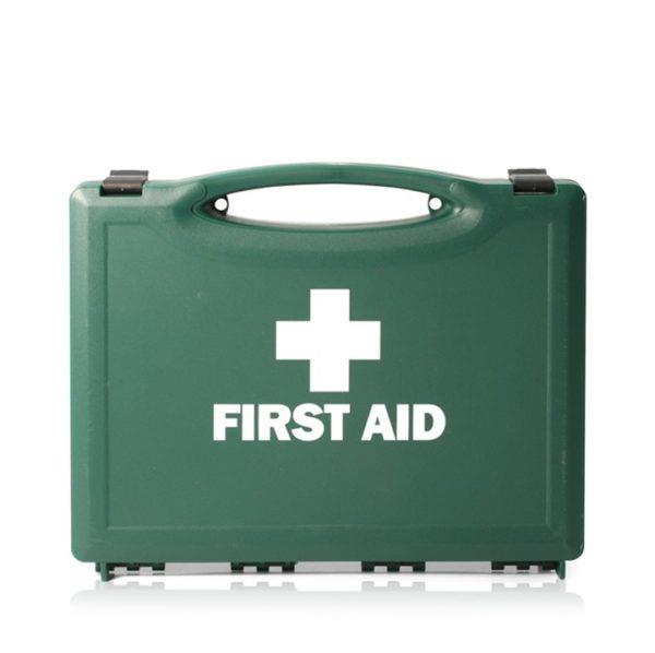 It comes in a robust green polypropylene box with carrying handle and a first aid logo on the cover