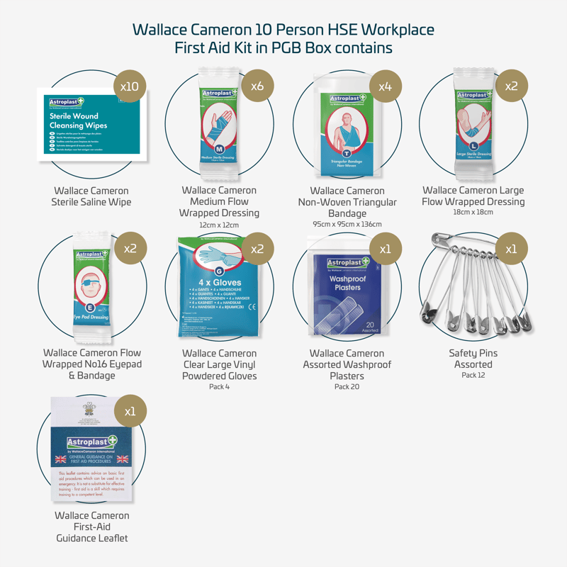 First Aid for up to 10 persons ( Can be wall-mounted) available in the first aid green box. This meets the minimum approved code of practice. Food hygiene kits contain blue detectable items.