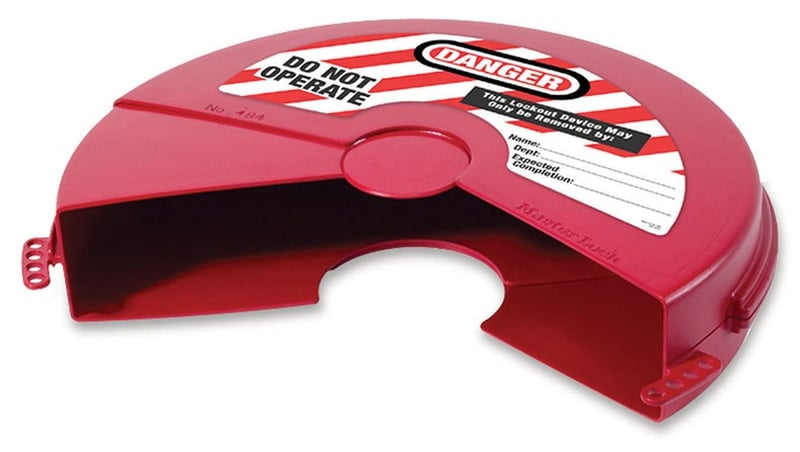 The Master Lock No. 484 Rotating Gate Valve Lockout Device features a 3-3/8in (86mm) depth and 4in (101mm) stem opening for 8in (203mm) to 13in (330mm) diameter valve handles to surround the valve operating handle to protect against accidental valve opening. The unique, patented rotating design allows for easier installation in confined space applications. Tough, lightweight, dielectric Zenez™ Thermoplastic body withstands chemicals and performs effectively in extreme conditions. Includes high-visibility permanent safety labels.