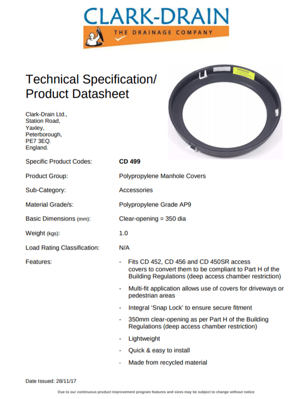 Fits CD 452, CD 456 and CD 450SR acces covers to convert them to be compliant to Part H of the Building Regulations (deep access chamber restriction)