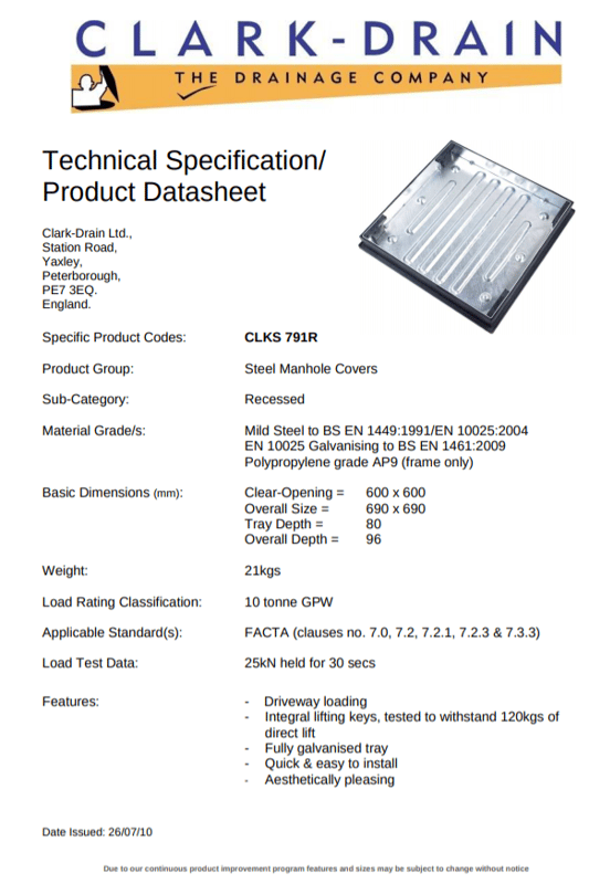 Steel Manhole Cover - Recessed - External Dimensions- 690 (L) x 690 (W) x 96 (D) - Special Order