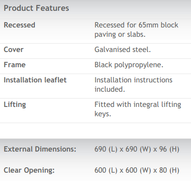 *Please note that all our Recessed Covers and Frames are brand new. As an industrial product designed for use on a floor and on the ground, they are not packaged the product may have some scuffs, marks or can collect dust.