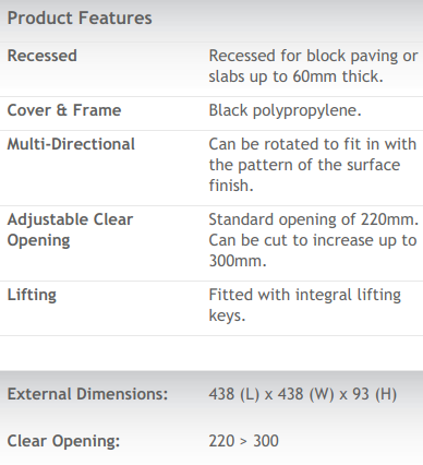 Recessed for Block Paving or Slabs up to 60mm Thick - Black Polypropylene - External Dimensions- 438 (L) x 438 (W) x 93 (D) - Special Order