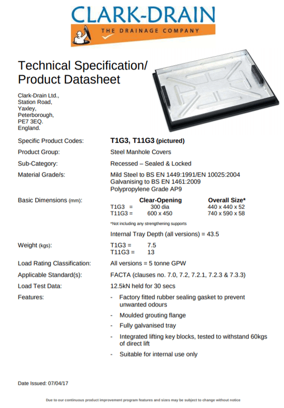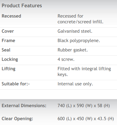 Galvanised Steel Cover and Black Polypropylene Frame - Rubber Gasket Seal - Recessed - External Dimensions- 740 (L) x 590 (W) x 58 (D) - Special Order