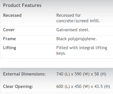 Galvanised Steel Cover and Polypropylene Frame - Recessed - External Dimensions- 740 (L) x 590 (W) x 58 (D) - Special Order