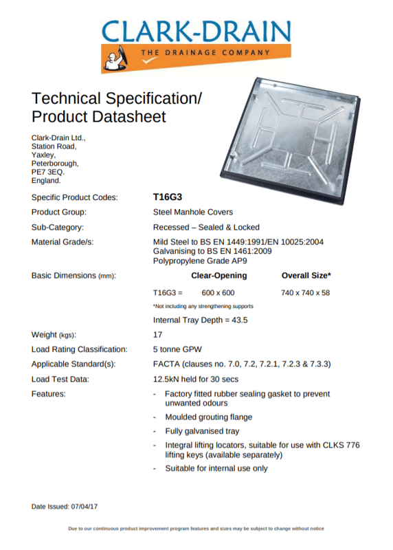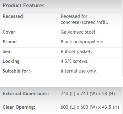 Galvanised Steel Cover and Black Polypropylene Frame - Rubber Gasket Seal - Recessed - External Dimensions- 740 (L) x 740 (W) x 58 (D) - Special Order