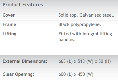 Solid Top Galvanised Steel - Frame Black polypropylene - External Dimensions- 663 (L) x 513 (W) x 30 (D) - Special Order