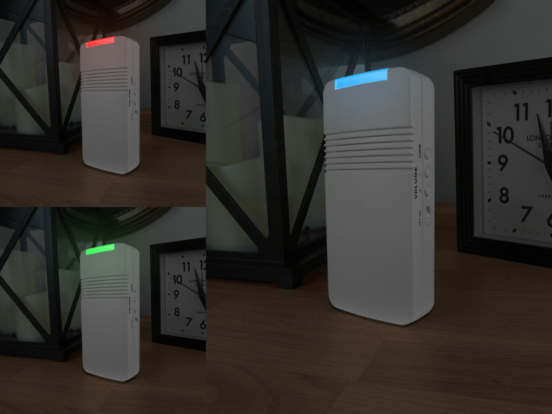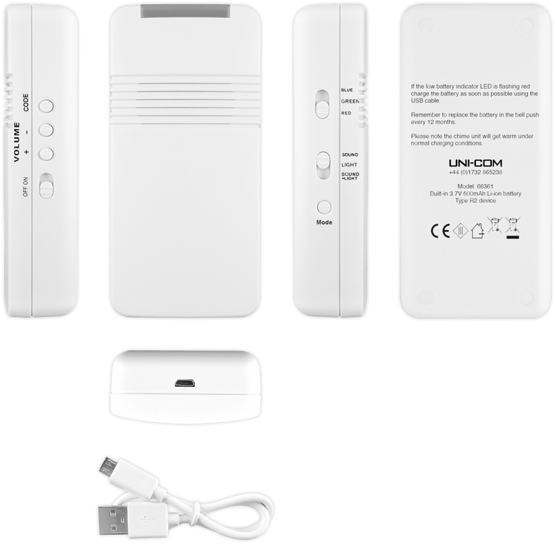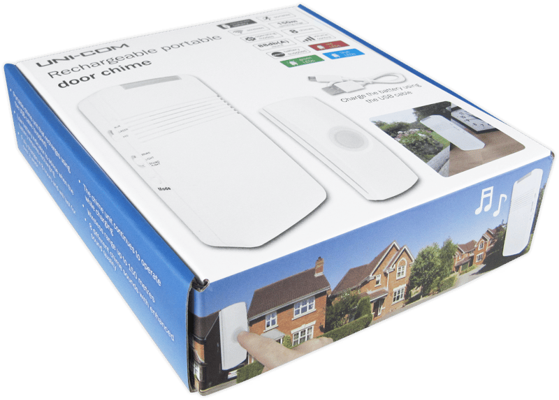 This rechargeable door chime offers all the advantages of a portable chime unit without the added cost of having to replace batteries. The extensive wireless range of up to 150 metres means the chime unit can be carried from room to room and outside into the garden to ensure a visitor is never missed. The chime unit will last for over a week before the battery needs recharging using the USB cable, and will continue to operate while charging. The weather resistant bell push is easy to attach near your front door and is paired quickly to your chime unit.The chime unit can be programmed to one of 8 enhanced chimes that include the Westminster chime, traditional Ding Dong or a barking dog for increased security. The lens on the top of the chime unit is a flashing or steady chime alert which will illuminate in your chosen colour (red, blue or green). There are 3 operating modes including a light only option which is ideal for when children or shift workers are sleeping.This Uni-Com door chime is one model of an exclusive Amazon range, they all work together and can be mixed and matched throughout your home. Each model offers its own unique features to help cater for different types of lifestyles. Features: