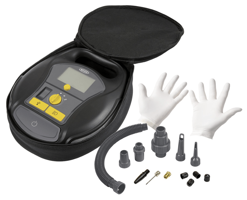 Comes with LED light to make night time inflation easier and safer. Also comes with 10 piece adaptor set for use with tyres, bicycle tyres, motorcycle tyres, balls, airbeds and other inflatables. Includes case and storage for adaptors.