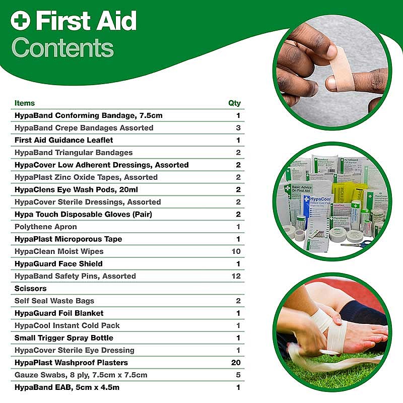 Rugby First Aid Kit has been designed for contact sports and is ideal for rugby teams. Contact sports have a higher level of risks which makes a suitable first aid kit a necessity. Rugby First Aid Kit comes fully stocked and complies with RFU Guidelines. The first aid content is stocked in a water resistant run on bag which can be used in any weather condition. The first aid kit has great portability and can be transported easily to a casualty for a quick response. Refills are available when needed.Description: