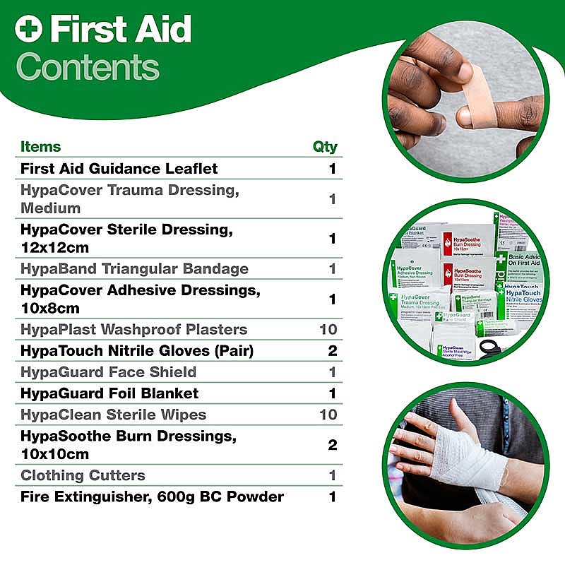 This Truck and Van First Aid Kit in Evolution Box is designed to provide suitable first aid contents for medium vehicles with 1 - 8 passengers such as trucks, vans and commercial vehicles. Compliant with British Standard BS 8599-2 requirements for motor vehicle first aid kits. The first aid contents are supplied in a durable evolution box, keeping it protected. The small case makes the kit easily portable and stored easily in the vehicle. Kit includes a 600g BC powder fire extinguisher.Description:
