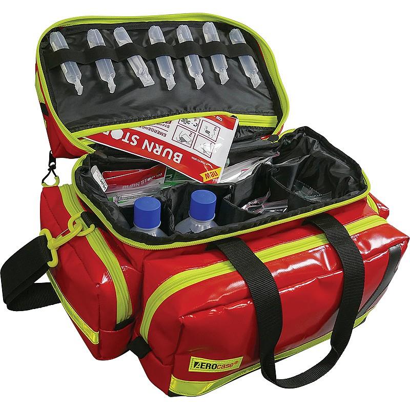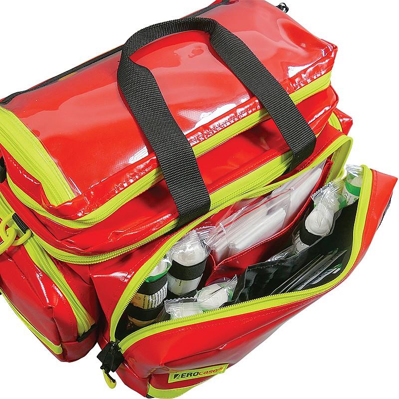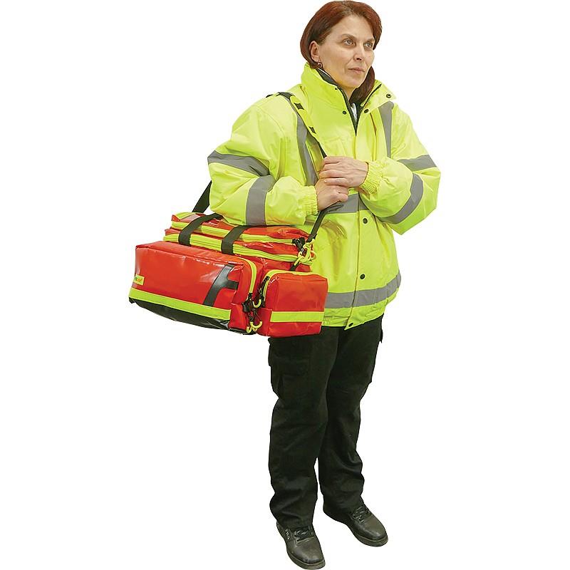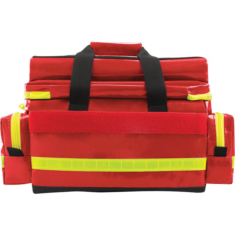 This emergency medical bag is perfect for professional first aiders. Robust, durable, highly visible, and simple to handle, this bag features a large padded main compartment with a moveable and removable interior divider for easily customizable organization and protection. The lid includes an added internal zip pocket and an elastic attachment strap with loops for ampoules, syringes, and other similar items, with additional elastic attachment straps inside the front pocket. The bag also incorporates two side pockets and a transparent document pocket on the top. This versatile medical bag has a total of approximately 28L of storage space.Wipe clean and ultra-tough. Suitable for emergency services.