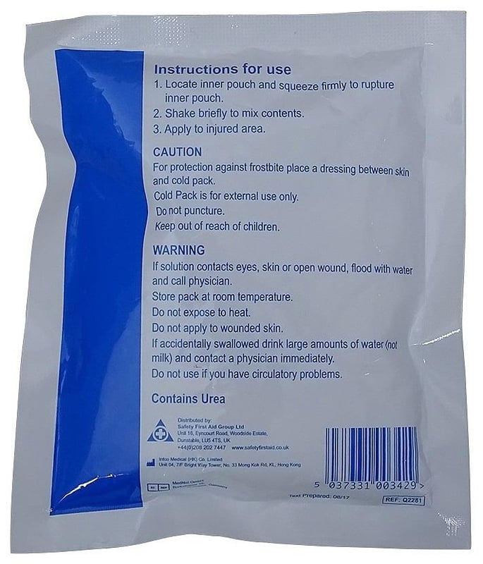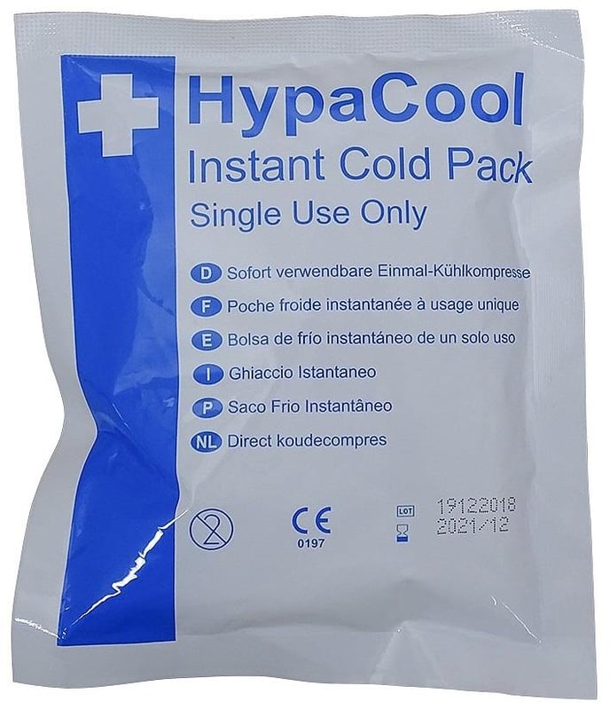 As part of RICE treatment for muscle and joint sprains and strains, cold therapy is used in the first stage of an injury to slow down the blood flowing into an injured area, reducing pain and swelling. HypaCool Instant Cold Packs are ideal for emergency pitch-side use or relief on the trail. The ice packs are activated when squeezed, triggering a cooling chemical reaction, and do not require pre-cooling in a freezer, meaning they're ready whenever and wherever you need them. The HypaCool Instant Cold Packs help relieve pain, reduce swelling and are quick, easy, and mess-free. HypaCool Instant Cold Packs are single-use only and easy to dispose of in ordinary household or business waste. Please do not apply directly to the skin.Description: