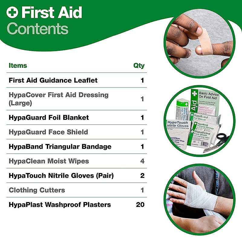 The first aid kit comes fully stocked and includes a first aid guidance leaflet enabling ordinary people to give first aid without special previous training. The vinyl wallet is easy store and carry, making it an ideal kit for employees to take off-site. Refills for this first aid kit can be bought separately when needed.