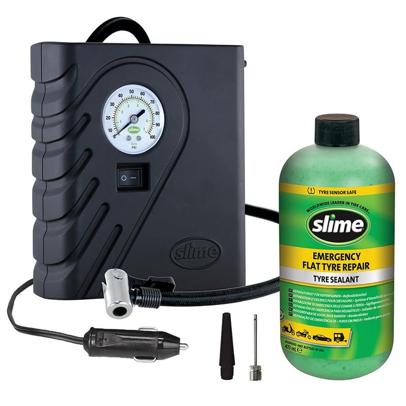 Slime's product range is the world’s safest and most effective sealant. When a puncture occurs, the patented sealant is carried directly to the puncture. The pressure of the escaping air forces the Fibro-Seal® particles into the opening, where they build up and intertwine to form a long-lasting, flexible plug. Instantly, air loss is blocked and a flat tyre is prevented.Our Smart Repair Emergency Tyre Repair Kit contains a 12V compressor with instructions and a 500ml bottle of sealing liquid.