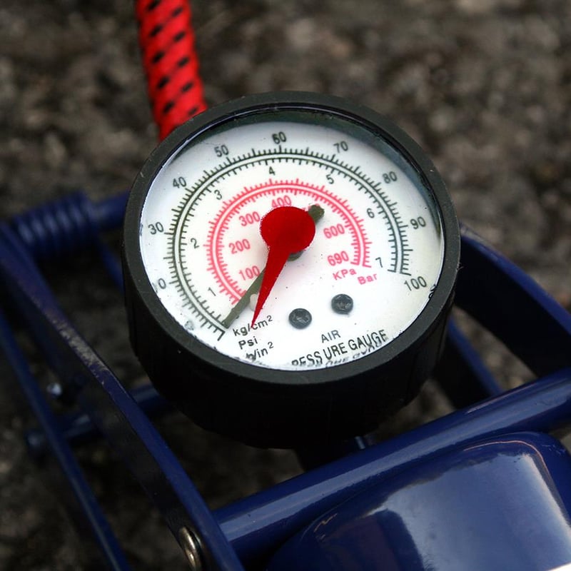 Features a heavy duty 52cm hose, with thumb lock and non-slip tread plate for stability. Also includes a red marker needle pressure gauge for accurate inflating.