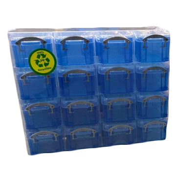 This set consists of the following items: 1 x 0.14 litre Really Useful Organiser tray (clear) 16 x 0.14 litre Really Useful Boxes (Transparent Blue).