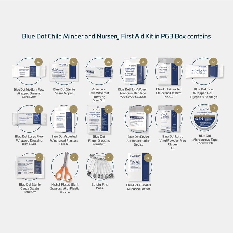 Child Minder and Nursey First Aid Kit contents include a selection of dressings and plasters to ensure that minor first aid emergencies can be dealt with quickly and effectively. Supplied in a durable plastic case.Kit Includes: