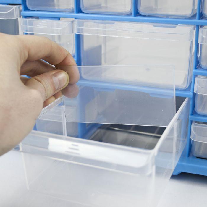 These DIY Storage Workshop Cabinets are ideal for keeping your small parts and pieces neat and organised. They have a whole host of drawers to be filled, helping you to keep everything organised. These are perfect for DIY tools, sewing kits, craft items and more.DIY Storage Set FeaturesThese storage units are made from a tough plastic which is both lightweight and durable. Each drawer has a protruding handle at the front for easy access, and each drawer has a stop latch inside the main unit to stop is coming out all the way. The cabinet can be used freestanding, but there are also slots on the unit for fixing to a wall if required. There are grooves on the top of each unit and ridges on the bottom, which allow you to stack organisers on top of each other if necessary. This allows you to slowly build your kit by adding a new one when necessary.Drawer SizesThese particular units have 22 compartments for storing your items. The configuration sees 14 smaller drawers sat amongst 8 larger drawers, to allow for items of different sizes to be stored without having to purchase multiple storage cabinets. The smaller drawers measure 5cm x 3.5cm and are 14cm deep, making them perfect for screws, washers and other small items. The larger drawers below measure 11cm x 6cm and are also 14cm deep. Each drawer also has a removable divider, which can be used to split a compartment into two. This allows you to store two separate sets of items in one drawer.Ideal for EveryoneThese DIY Bits Organisers have plenty of uses and are set up in seconds. The set comes pre-assembled, so installation is completed simply by removing the packing! For DIY enthusiasts there is plenty of space for a myriad of tools. They're ideal for storing screws, nails, bolts, washers...you get the idea! Craft lovers will also find them incredibly useful, with enough space for sewing threads, model paints and more. They're also perfect for office storage for stationary and other bits and pieces.22 Drawer Storage Unit Specifications:
