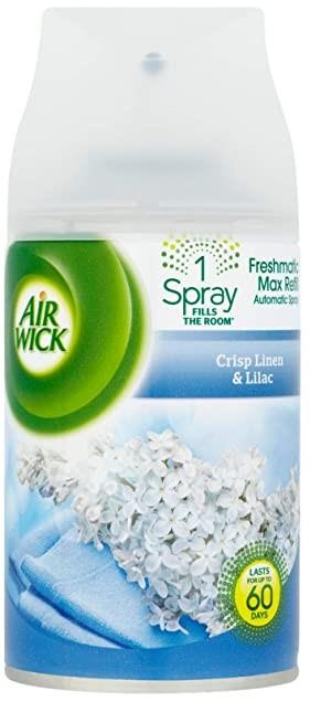 Air Wick Freshmatic Max Air Freshener is enough to fill a room. Bring to life the crisp, cool elegance of fine linen, accented with the fragrant touch of wild lilac. Air Wick Freshmatic Sprays release bursts of continuous fresh fragrance so your home always smells welcoming. Fragrances your home for up to 60 days per refill when on low setting using the Air Wick Freshmatic Max Automatic Spray Dispenser.