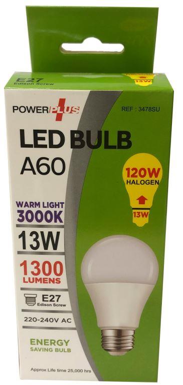Power Plus - 13W - E27 Energy Saving A60 LED Bulb - 1300 Lumens - 3000k Warm Light - Pack of 12 - [PU-3478]