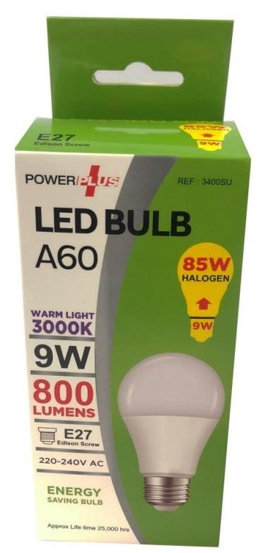 Power Plus - 9W - E27 Energy Saving A60 LED Bulb - 800 Lumens - 3000k Warm Light - Pack of 12 - [PU-3400]