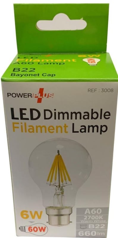 Power Plus - 6W - B22 Energy Saving A60 LED Filament Bulb - 660 Lumens - 2700k Warm White - Pack of 12 - [PU-3008]