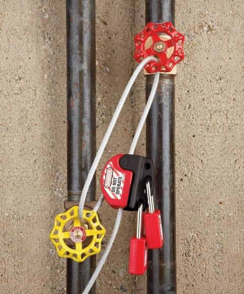Integrated safety hasp and cable is ideal for multiple circuit breaker panel and side-by-side gate valve lockouts