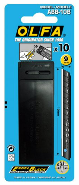 The 9mm EXCEL BLACK™ blade is 0.38mm thick and has 13 snap segments. The plastic pack has a useful section which you can use to snap off and safely store used blade segments.