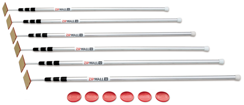ZipWall® 12 6-Pack contains six 3,6 m aluminum, spring-loaded poles with parts (heads, plates, and GripDisk™ non-slip pads).