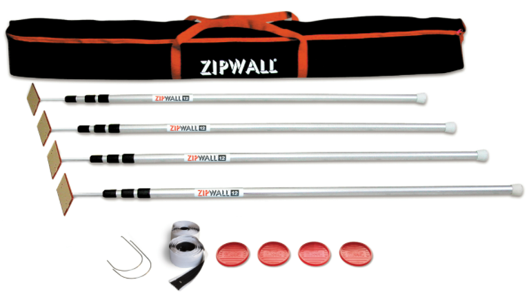 ZipWall® 12 4-Pack contains four 3,6 m aluminum, spring-loaded poles with parts (heads, plates, and GripDisk™ non-slip pads), a standard zipper 2-pack, and one ZipWall® carry bag.
