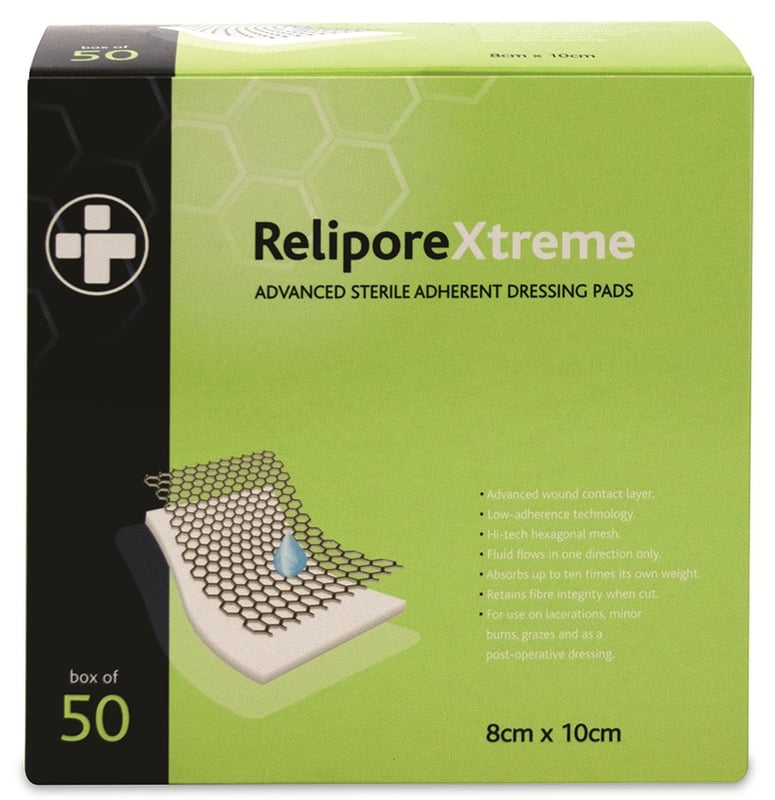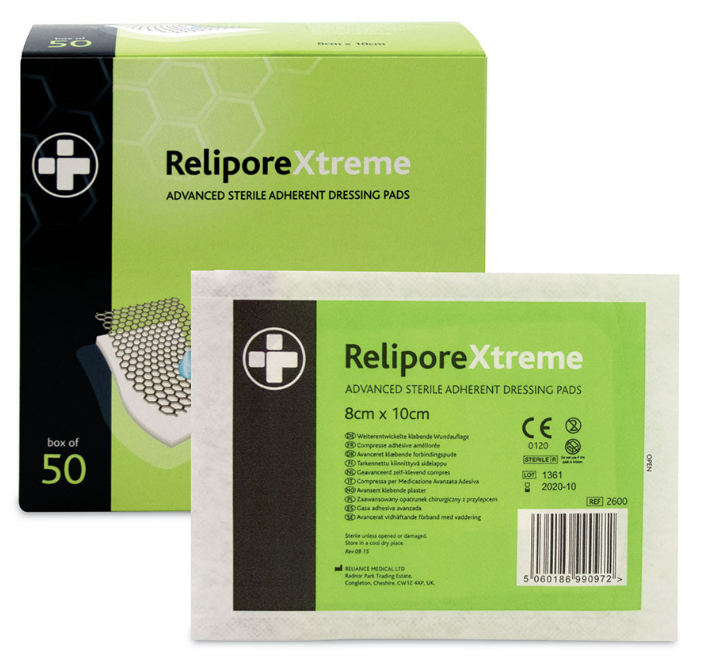 | ReliporeXtreme uses an advanced wound contact layer that encourages fluid to pass from the surface through to the absorbent layer, but helps prevent it striking back through. This is achieved using hexagonal shaped pores that have a burr on the underside of the layer. The layer is constructed from a superior nylon polymer that prevents adherence to the wound site.The ReliporeXtreme dressing features a wound contact layer on one side - and on the other - a flexible, breathable, adherent stretch fabric that conforms to the body, is easy to remove, but remains securely in place once applied.The pads are packaged in an easy to open pouch that can act as a sterile field for the dressing whilst a wound site is being prepared. One side of the pouch is transparent, assisting clear product identification in low light conditions.