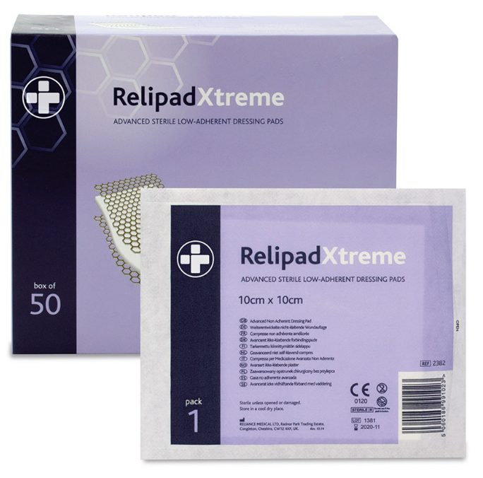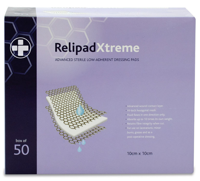 The RelipadXtreme dressing features a wound contact layer on both sides, allowing for correct application in low light conditions. The hexagonal design of the wound contact layer helps prevent strike-through to the back of the dressing. The pads are packaged in an easy-to-open pouch that can serve as a sterile field for the dressing whilst a wound site is being prepared. One side of the pouch is transparent, assisting clear product identification in low light conditions.