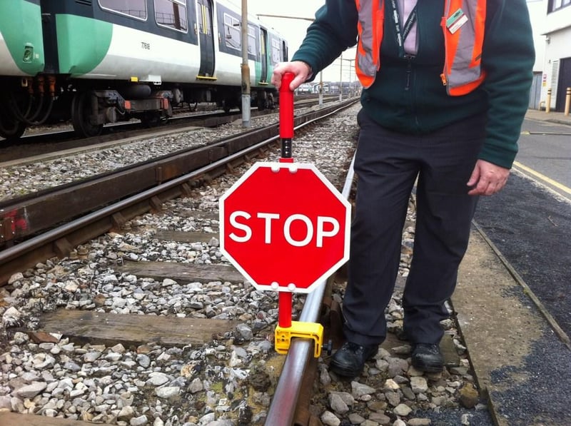 A Network Rail Approved compact & lightweight Possession Limit Board with integral rail top Clamp
