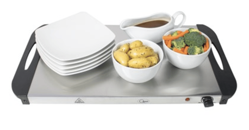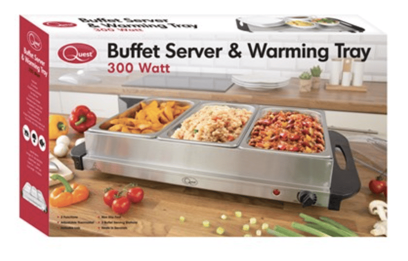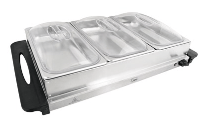 Quick and easy to set up and use. It has three warming pans with transparent lids and stay cool handles. It heats in seconds and maintains that heat. Can be used as a hotplate as the warming pans and surround are removable for cleaning and trays are dishwasher safe.Indicator light on variable heat dial switches off when at desired temperature but the trays will not lose the heat - temperatures between 105 and 185 degrees. 300 watt