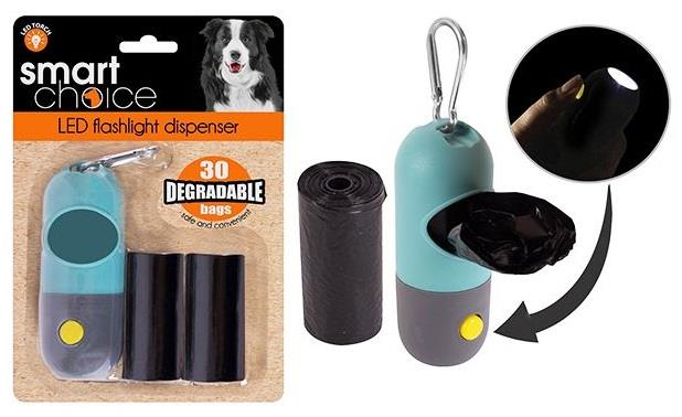 The Smart Choice Flashlight Degradable Dog Poop Bag set includes two refills with an LED flashlight dispenser, which can be illuminated in dark conditions and conveniently dispenses dog poop bags for convenient dog waste disposal.
